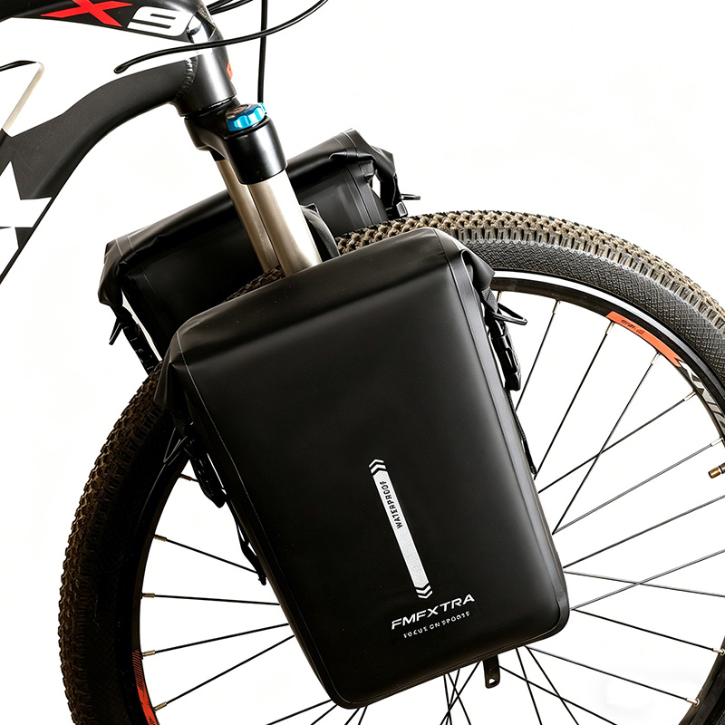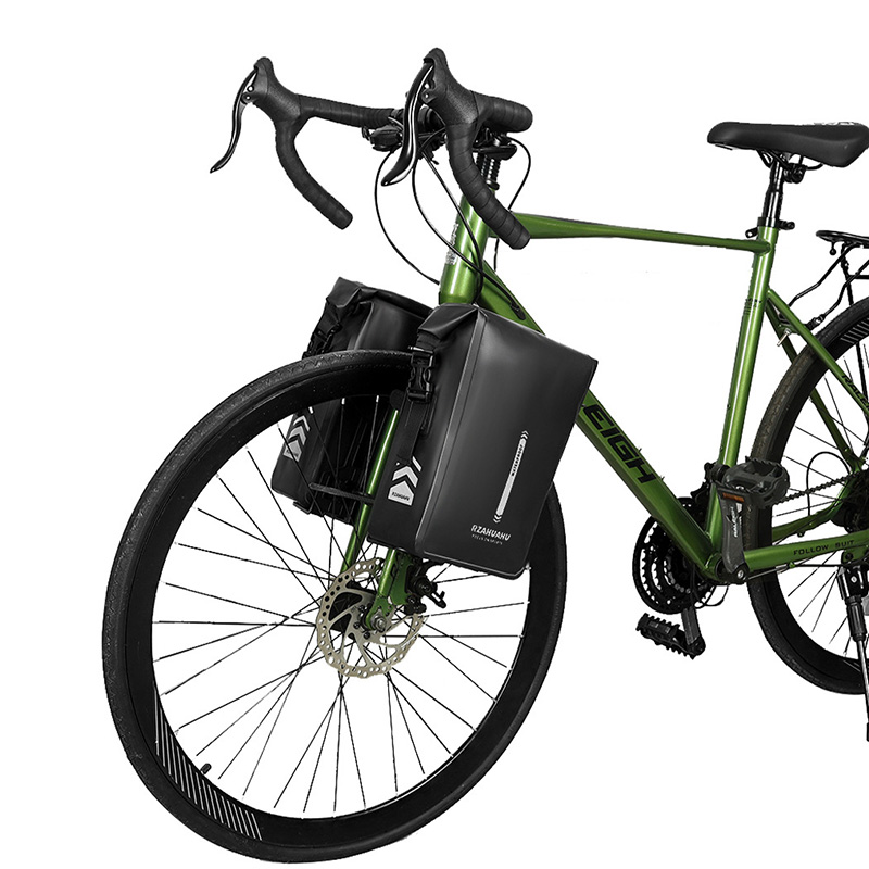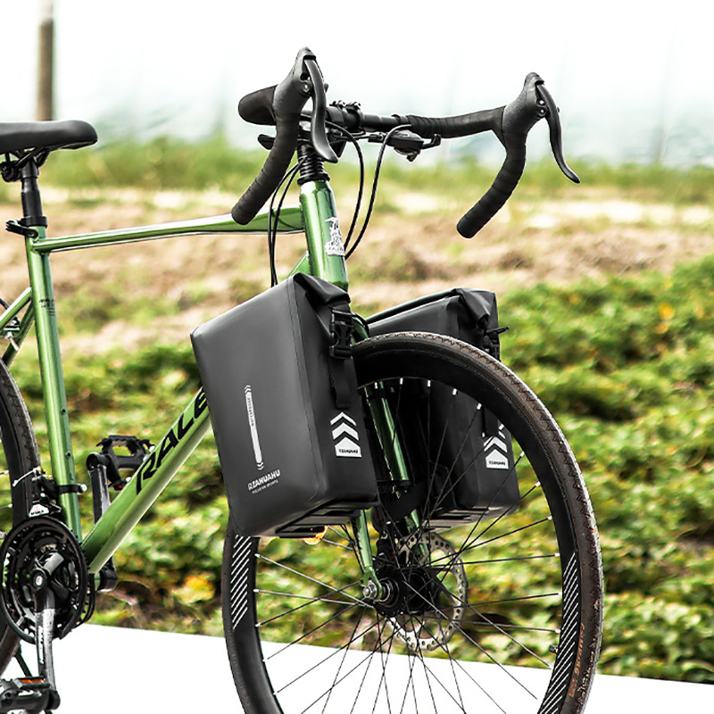 Fully waterproof bicycle front fork bag with rolled edge closure method the opening does not come into direct contact with rainwater making it less likely for water to enter